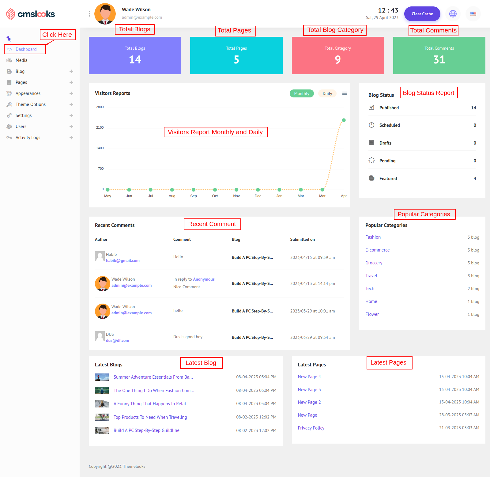 Here you can find the Total Blogs, Total Pages, Total Blog Category, and Total Comments. Visitors Report monthly and daily, Blog Status Report, Recent Comments from the blog, Popular Categories by blog count, Latest Blogs and Latest Pages.