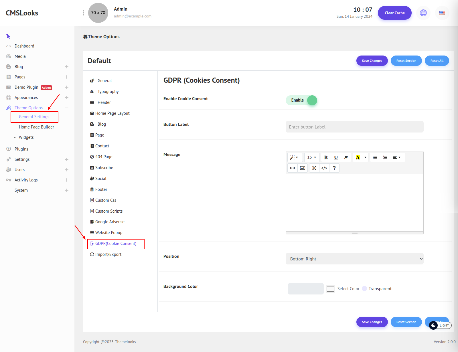 You can customize the GDRP (Cookie Consent) as you like. Follow Theme Options > General Settings. Here click the GDRP (Cookie Consent) tab and its related fields will appear.