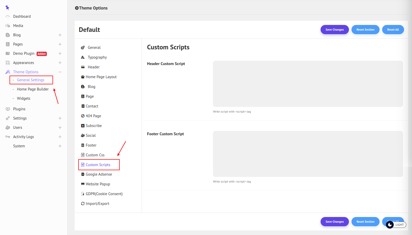 Follow Theme Options > General Settings. Then Click on the Custom Scripts tab. All the fields related to custom scripts will appear.