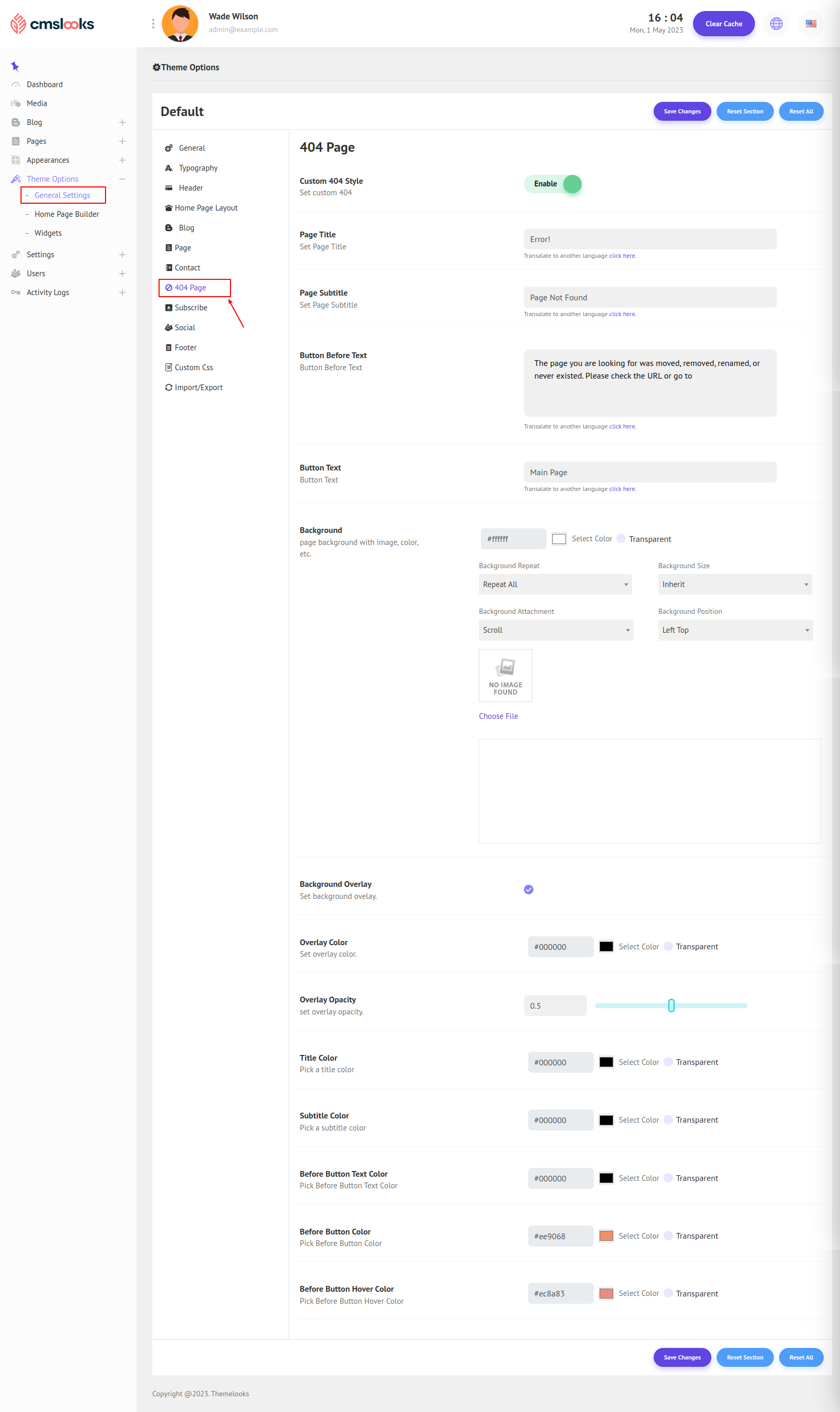 You can customize the 404 Page as you like. Follow Theme Options > General Settings. Here click 404 Page, and the 404-page fields will appear.