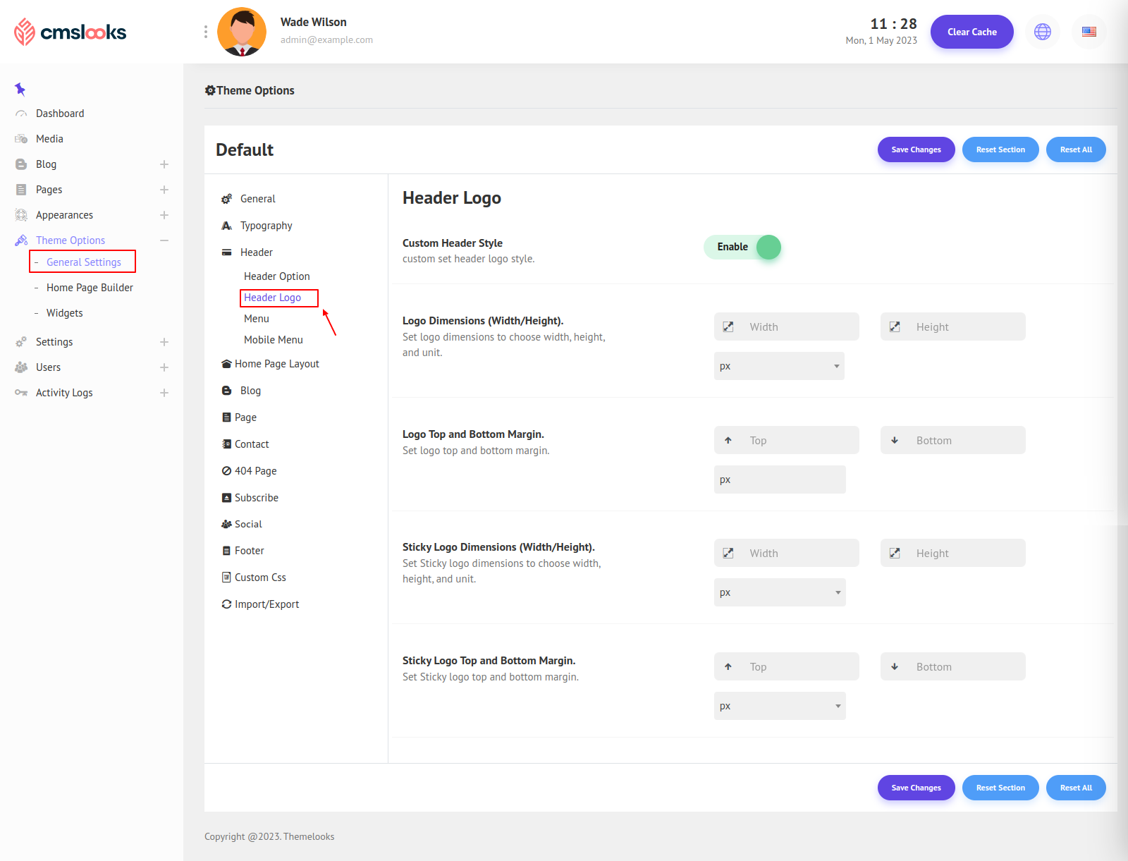 Click Save Changes to save theme options. Click Reset Section to reset only this section. Click Reset All to reset all theme options.