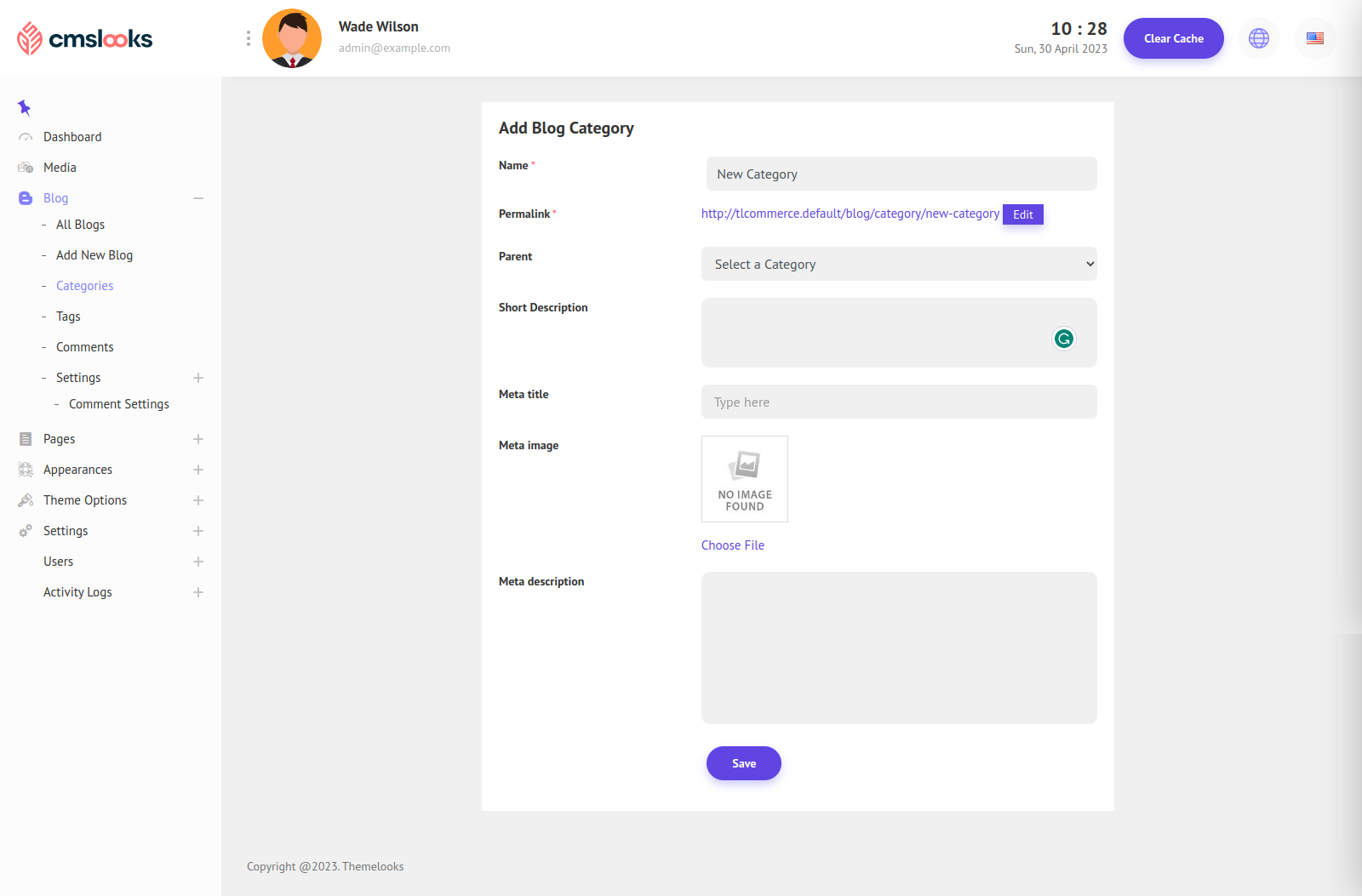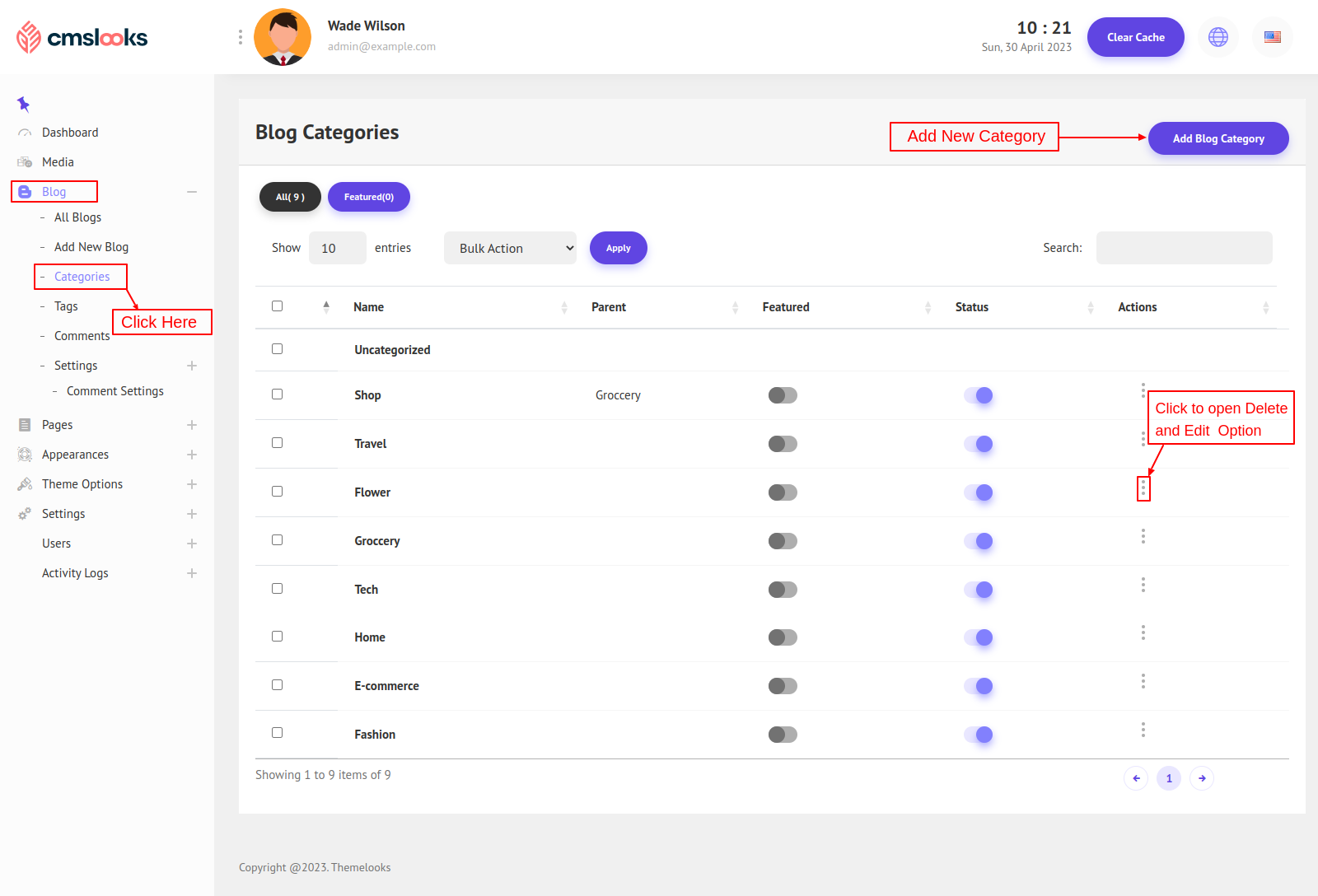 In this post, we will learn how to manage Blog Categories. Follow Blogs > Categories and you will be redirected to the category list page. Here you can find all the available categories, you can search and find, filter, manage, delete and create new ones.