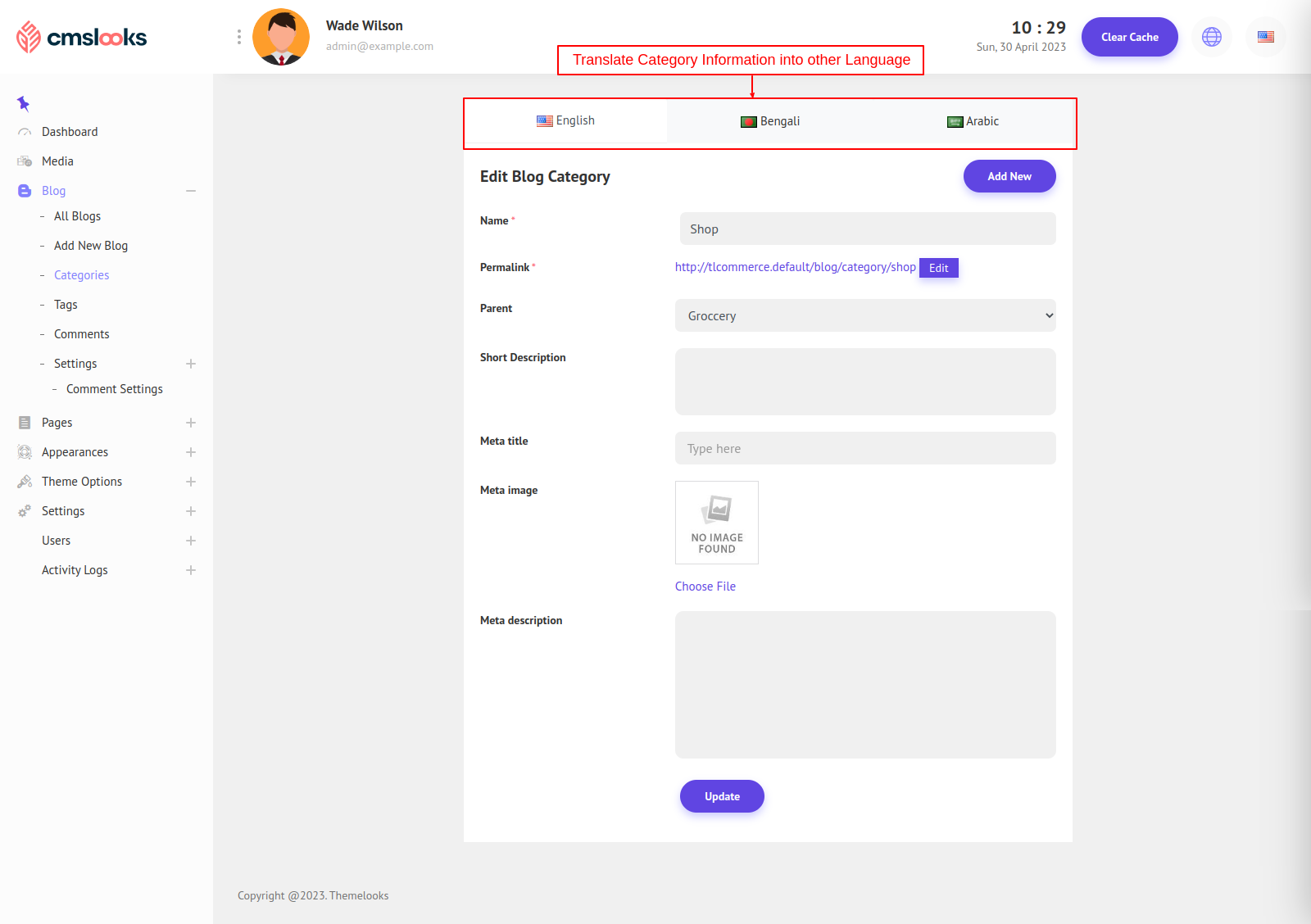 To Edit a Category click Edit from the list page and you will be redirected edit page. Here you can translate category info into another language also. To Delete a category click Delete.