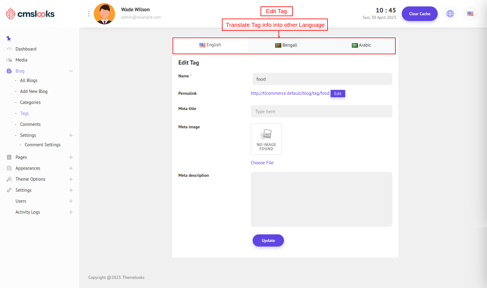 To Edit a tag click the Edit link from the list page and you will be redirected edit page. Here you can translate tag info into another language also. To Delete a tag click Delete.